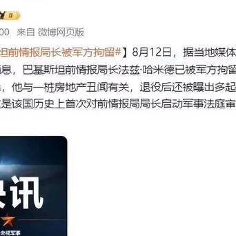 【美国在巴基斯坦安插的高级间谍,疑似被中巴合作逮捕】据巴基斯坦《黎明报》8月12日报道,巴基斯坦军方已逮捕前三军情报局(ISI)局长哈米德(Faiz Hameed)中将并启动审理程序。这是巴军方首次审判ISI退役高官。据巴三军公共关系部(ISPR)8月12日声明,巴军方在哈米德退休后指控其在任期间多次违反《巴基斯坦陆军法》、涉嫌参与“Top City住房计划”腐败案。